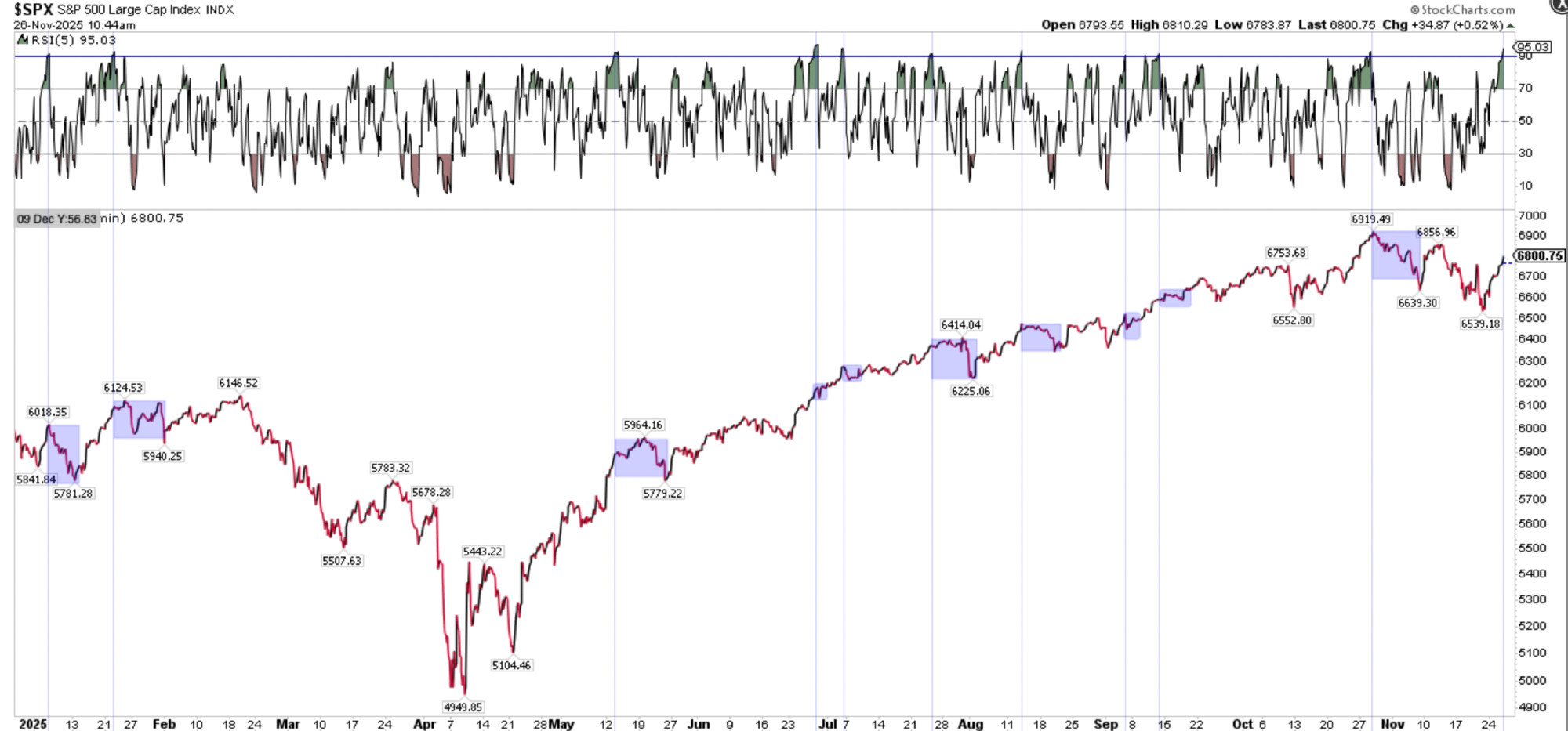 A proposito di quanto dicevo ieri, invece, sulla possibilità di una pausa e un test del supporto a 6750 punti, il sempre ottimo Urban Carmel ha osservato che negli ultimi 4 giorni l’RSI orario a 5 periodi è arrivato oltre 90, e quasi tutte le (numerose) volte che è successo nel 2025 (indicate dalle aree ombreggiate nel grafico) si è avuto un modesto consolidamento.