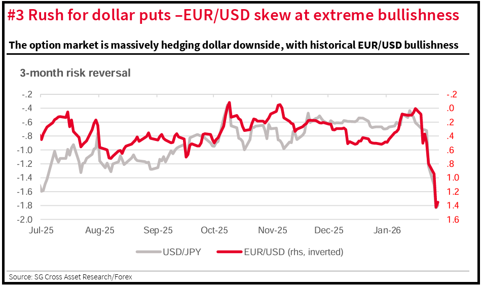 Detto questo, ormai tutti sono sintonizzati alla perfezione sulla debolezza del Biglietto verde, e timorosi di un debasement serio della divisa USA. Per cui sembrano tutti corti o esposti al ribasso, come mostra questo grafico di Socgen.
