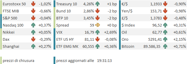 In particolare la dichiarazione sullo Yen ha dato ulteriore forza ad un rimbalzo del dollaro già in corso, non solo contro lo Yen. Wall Street ha continuato ad indebolirsi fino a cancellare i progressi, ed anche i rendimenti USA hanno preso a salire. In questo contesto le piazze europee hanno accumulato altro ribasso, fino a chiudere con perdite materiali, con solo Dax e Piazza affari a limitare il calo sotto il punto percentuale. I rendimenti conservano cali moderati, mentre l’€ cede quasi un punto al Dollaro.