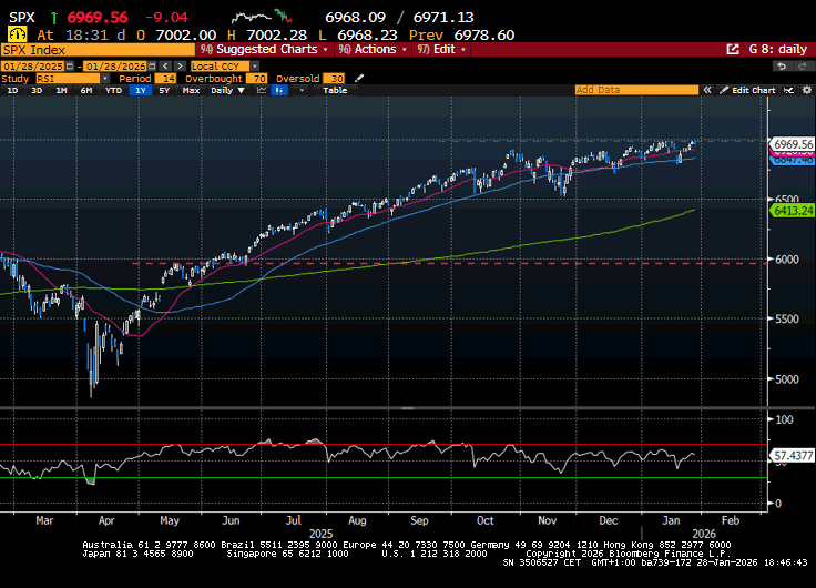 Come detto ieri, stasera il FOMC dovrebbe lasciare i tassi invariati, con il solo Miran a dissentire (ma non è escluso che anche Bowman e Waller lo facciano). I dati sono migliorati (la Fed di Atlanta colloca la crescita per Q4 2025 al 5.4%), il mercato del lavoro sembra meno in crisi, e l’inflazione non ha dato colpi di recente, ma con il Dollaro che cala e le commodity che volano non c’è troppo da rilassarsi. C’è un rischio di un FOMC più hawkish, anche se tanto tra 4 mesi cambia il presidente. Per cui un po’ di diffidenza dei mercati ci sta, tanto più che dopo la chiusura ci saranno le trimestrali di Microsoft, Tesla e Meta.
