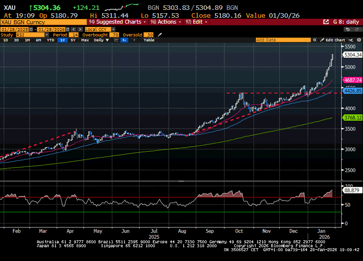 Chiusura positiva con record ieri sera (martedì) per Wall Street, con l’S&P 500 (+0.41%) a superare il precedente massimo di appena un punto. Anche meglio il Nasdaq 100 (+0.88%) che ha fatto il nuovo massimo dell’anno, ma deve ancora superare quello fatto il 28 ottobre 2025. Bene anche le Magnificent 7 (+0.89%), ancora marginalmente sotto i massimi di fine ottobre, mentre le small caps del Russell 2.000 hanno ancora sottoperformato (indice +0.26%). La breadth è stata bruttina, con meno della metà delle azioni dell’S&P 500 a salire (234) e infatti l’S&P 500 Equal Weight ha ceduto lo 0.15%. La forza è venuta dai semiconduttori (Sox +2.40%) e colossi connessi grazie al tambureggiare di news di domanda inestinguibile,  una forza che sembra continuare anche oggi grazie alle trimestrali di ASML e Hynix . Detto questo, anche il crollo continuato del Dollaro, che ieri, come Dollar index, ha fatto i minimi da quasi 4 anni, è stato un bel supporto per i real assets quotati in USD, come le azioni, e le commodities, preziosi in testa, che hanno segnato nuovi massimi. Il petrolio poi continua ad ottenere supporto da parte dell’ “armata” mandata da Trump in medio oriente, con la possibilità crescente di un nuovo attacco all’Iran.