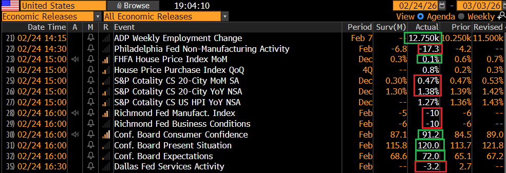 Il dato più seguito in pubblicazione oggi, la Consumer Confidence del Conference Board di febbraio, ha messo a segno quello che sembra un buon rimbalzo, assai meglio delle attese, equamente distribuito tra expectations e present situation. Dico che sembra, perchè il dato di gennaio è stato rivisto al rialzo a tal punto da far diventare il rimbalzo della present situation un calo. Anche qui quindi letture ben poco affidabili. Ma il morale degli americani sembra migliore di quanto stimato in precedenza.