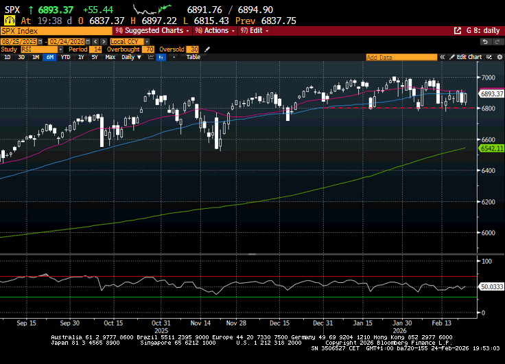 Dopo la chiusura europea l’S&P 500 ha preso ancora qualcosa, con il Nasdaq che outperforma moderatamente. Vediamo se i progressi vengono mantenuti, oggi. Questo è al momento il terzo tentativo di rally che va ad attaccare la soglia di 6900 punti nello spazio di 5 giorni. Un’altra respinta non aiuterebbe il quadro tecnico. Però l’aspetto positivo è che i minimi di gennaio in area 6800 punti sono stati testati 2 volte a febbraio e hanno tenuto. Questa oscillazione per ora non li ha toccati. Il range si sta restringendo. Vediamo in che direzione ne usciamo.
