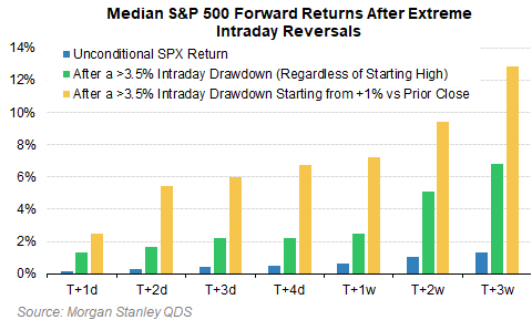 Il team quantitativo di Morgan Stanley ha effettuato un backtest, andando a cercare tutti gli episodi in cui in una seduta si è avuto un calo dai massimi di oltre il 3.5%, in generale, e poi formando un sottoinsieme con quelli partiti con un gap up di oltre l’1%. Lo studio mostra che le performance successive sono state assai migliori della media.