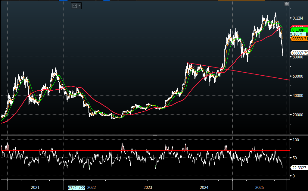 E’ assai probabile che la correzione non sia finita, visto quanto momentum ha il ribasso, e la totale assenza di un processo di bottom. Però qui una certa capitulation c’è stata, ed è probabile che a breve il movimento rallenti e si verifichino bruschi rimbalzi. E lo stesso si può dire per Bitcoin e le criptovalute, dove la price action di sicuro mostra capitulation (vedi il grafico di Bitcoin sotto, con RSI a 22).