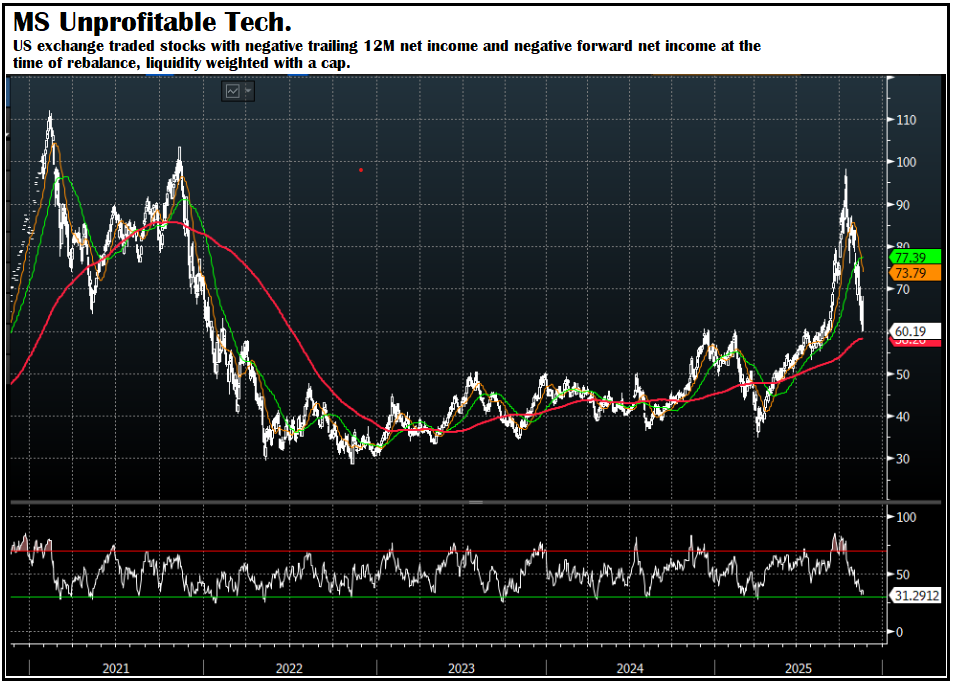 Però, se approfondiamo un po’ l’analisi, troviamo ambiti in cui il livello di stress è decisamente più elevato. Per esempio, la correzione del cosiddetto “unprofitable tech” ovvero l’insieme di tutte quelle aziende che non fanno utili e ancora non prevedono di farli (e in alcuni casi non fatturano nemmeno) che erano esplose per il fatto di appartenere a settori AI o ancillari come power generation, quantum computing, nuclear, software etc, è stata assai più drammatica: l’intero rally partito a fine agosto è stato rapidamente ritracciato, come mostra l’indice creato appositamente per monitorarle da Morgan Stanley.