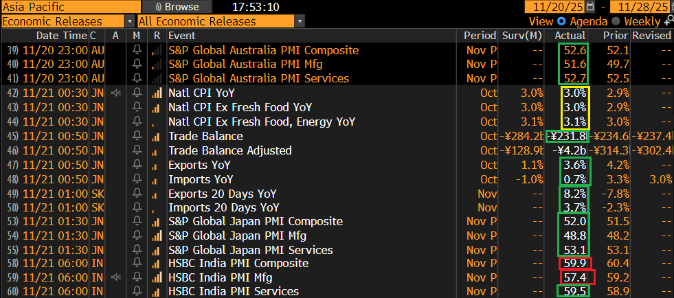 I PMI preliminari (o flash) di novembre hanno sorpreso in positivo in Australia, e hanno segnalato un attività in accelerazione in Giappone. Leggermente deludenti quelli dell’India, ma su livelli di crescita robustissima, sulla quale un modesto rallentamento del manifatturiero non influisce. Abbiamo poi avuto un bel rimbalzo dell’export della Sud Corea nei primi 20 giorni di novembre, con un +4.5% sul mese aggiustato per i giorni lavorativi. Bene anche la bilancia commerciale giapponese di ottobre, con un passivo assai inferiore alle attese, grazie all’accelerazione dell’export. Tutto ciò sembra indicare un aumento della domanda globale in autunno.