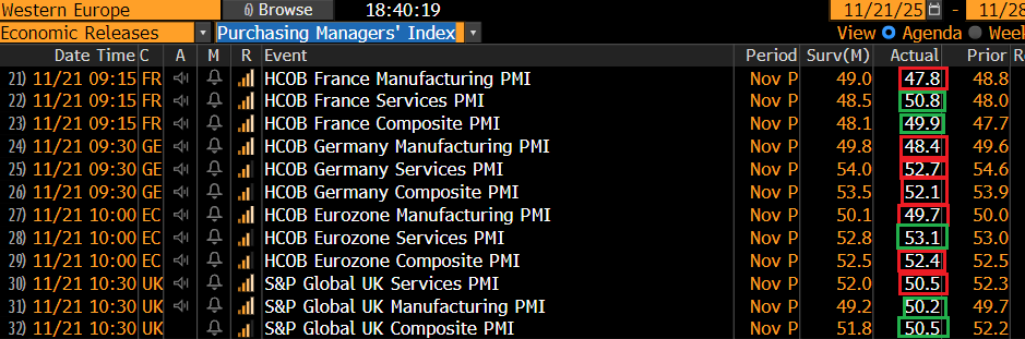 Per la cronaca, i PMI preliminari di Novembre hanno mostrato un manifatturiero in lieve assestamento ma dei servizi decisamente in forma, che hanno trainato il dato composite a ritoccare al rialzo il dato di ottobre. Molto bene i new orders, ai massimi dell’anno nei servizi. In generale l’output è indicato in espansione ad un livello nella parte alta del range degli ultimi 2 anni. Non proprio un economia moribonda.