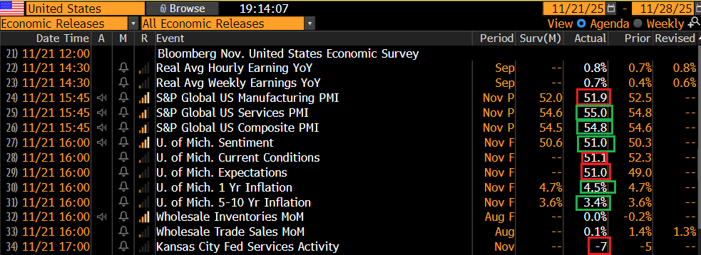 Anche qui i prezzi sui servizi hanno ripreso a salire rapidamente, una notizia un po’ in contrasto con tutte queste attese di easing. Ma tanto il BLS ha comunicato che il CPI di ottobre non uscirà, e quello di novembre verrà pubblicato dopo il 18 dicembre. Sembra fatto apposta per non disturbare il taglio della Fed. Poco mossa, e poco interessante a mio parere la U. of Michigan consumer survey di novembre.