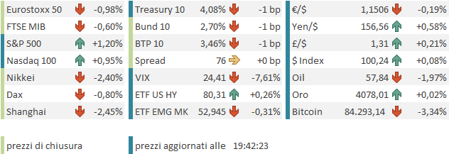 Le piazze europee hanno accusato la volatilità e le puntate in negativo di Nasdaq 100 e S&P 500 nel pomeriggio. Forse l’azionario continentale ha temuto un altro scherzo come quello di ieri, e così gli indici si sono progressivamente indeboliti, andando a chiudere con passivi non distanti dal punto percentuale in aggregato. Coerentemente l’IT è il settore peggiore , visto che molti titoli dovevano fattorizzare ancora i crollo di ieri sera dei business omologhi in US. Pesanti anche gli industrials, mentre consumer staples e telecoms hanno fatto bene. Moderati cali dei rendimenti, e dell’€, mentre le commodities si sono stabilizzate.