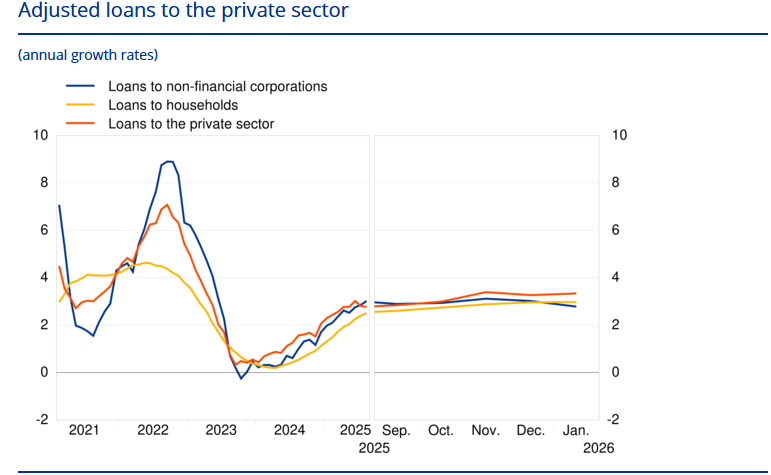 Sul fronte macro, un po’ di confidence in EU, di quelle che lasciano il tempo che trovano. In compenso gli aggregati monetari EU di gennaio hanno visto un bel balzo della crescita di M3 dal 2.8% al 3.3% anno su anno. M1, che comprende il circolante e i depositi overnight, è aumentato al 5,3% a gennaio rispetto al 4,7% di dicembre. Il tasso di crescita annuo dei depositi a breve termine (M2-M1) è stato pari a -0,6% a gennaio, rispetto al -0,4% di dicembre, e il tasso di crescita annuo degli strumenti negoziabili, (M3-M2) è aumentato all’1,6% a gennaio rispetto al -0,6% di dicembre. In generale un aumento di liquidità e strumenti monetari. E riguardo il credito al settore privato, il tasso di crescita annuo dei prestiti al settore privato si è attestato al 3,3% a gennaio, invariato rispetto al mese precedente. Nel dettaglio, il tasso di crescita annuo dei prestiti alle famiglie si è attestato al 3,0% a gennaio, invariato rispetto al mese precedente, mentre il tasso di crescita annuo dei prestiti alle società non finanziarie è diminuito al 2,8% a gennaio dal 3,0% di dicembre. La domanda di credito delle aziende EU sta un po’ rallentando negli ultimi mesi. Vedremo che succederà da febbraio in avanti.