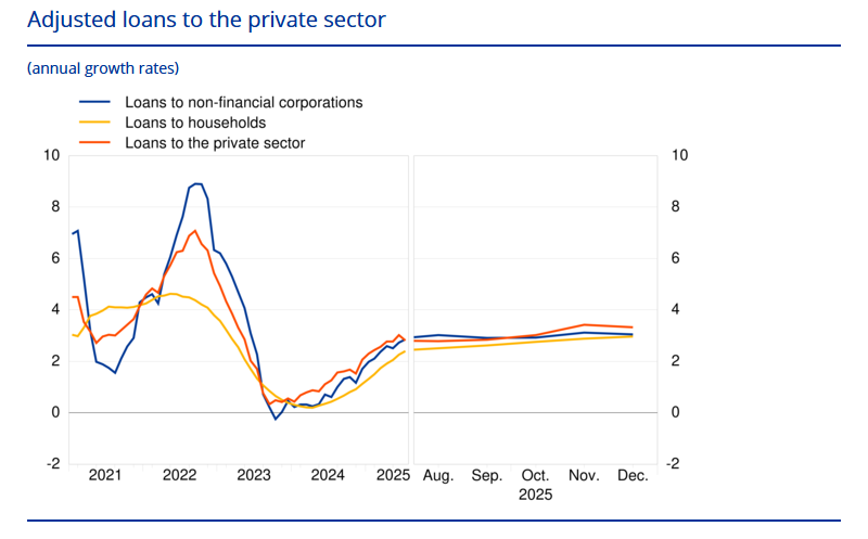 Sul fronte macro, di rilevante solo il bollettino ECB con gli aggregati di credito di Dicembre, che ha visto un lieve rallentamento del credito alle aziende. Il tasso di crescita annuo dei prestiti al settore privato si è attestato al 3,3% a dicembre, rispetto al 3,4% di novembre. Tra i settori , il tasso di crescita annuo dei prestiti rettificati alle famiglie è stato del 3,0% a dicembre, rispetto al 2,9% di novembre, mentre il tasso di crescita annuo dei prestiti rettificati alle società non finanziarie si è attestato al 3,0%, contro il 3,1% di novembre. Nulla di particolarmente rilevante, come mostra il grafico sotto.