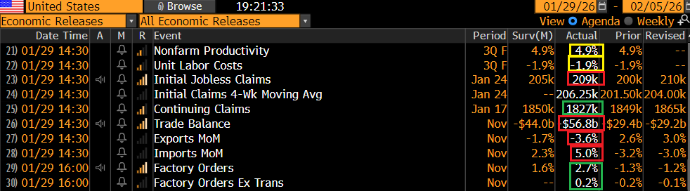 Come da attese, i tassi sono stati lasciati invariati, con i dissensi di Miran e Waller che avrebbero voluto 25 bps di taglio. Strano che Miran si sia limitato a 25, mentre Waller evidentemente spera ancora di succedere a Powell. Nello statement si è osservato che la crescita si è irrobustita, e sono comparsi segnali di stabilizzazione sul mercato del lavoro. Powell ha dichiarato che la Fed è “ben posizionata” (fregando la battuta alla Lagarde) e che però se il mercato del lavoro dovesse rallentare ancora riprenderanno i tagli, e lo stesso se l’inflazione calerà. In generale leggermente dovish come performance. Ma il mercato era già sintonizzato su questa musica. Powell poi non ha risposto a nessuna delle domande sulle inchieste su di lui e sulla Cook, sul suo futuro dopo la fine del suo mandato, se resterà alla Fed o no, limitandosi a ribadire che l’indipendenza della Fed è fondamentale. Al suo successore quindi raccomanda di stare lontano dalla politica e rispondere dell’operato solo al Congresso.