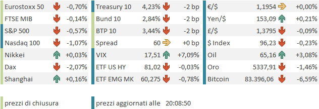 Le piazze europee hanno ovviamente accusato questa fiammata di volatilità. Hanno cancellato i guadagni e accumulato discreti passivi, Con il Dax, che già perdeva per bene, appesantito da Sap e dal settore software, e anche dai pharma, che ha lasciato sul campo il 2%. Meglio Milano e Madrid, che cedono marginalmente, e Parigi, che guadagna briciole. La risk adversion ha riportato in calo i rendimenti europei, mentre l’€ ha recuperato il calo accusato nel momento della massima volatilità e chiude poco variato.