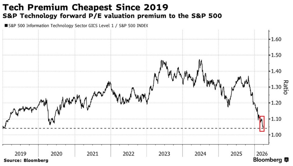 In effetti Bloomberg ha rilevato che il forward PE premium del settore  tecnologico  rispetto all’indice generale non era così basso da inizio 2019, 7 anni fa. Siamo al  4%.  Eravamo  oltre il 45% a metà  2024 e il  calo da ottobre 2025 è stato  del  32%. Some relative cheapening.
