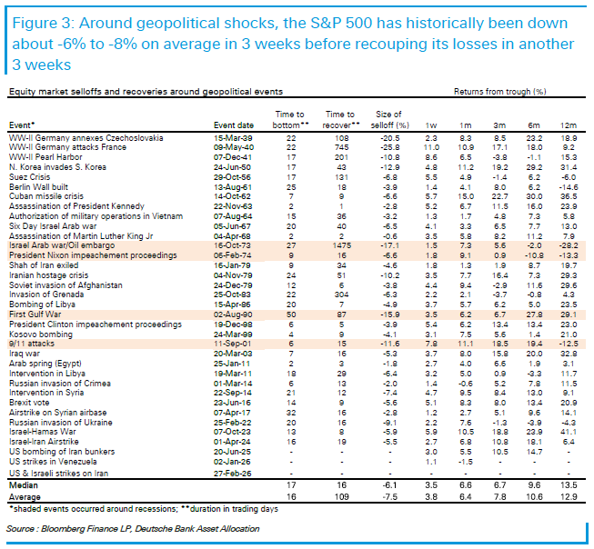In effetti con la discesa di venerdì, l’S&P 500 ha ceduto in linea con la  media delle  discese per eventi geopolitici dal 1939, ovvero un 7.5%. La mediana è  inferiore, un 6,1%. Come durata è  andato un po’  oltre mediana e media,  con 19  trading days dall’evento all’attuale  minimo (vedi schema sotto  di Deutsche Bank).