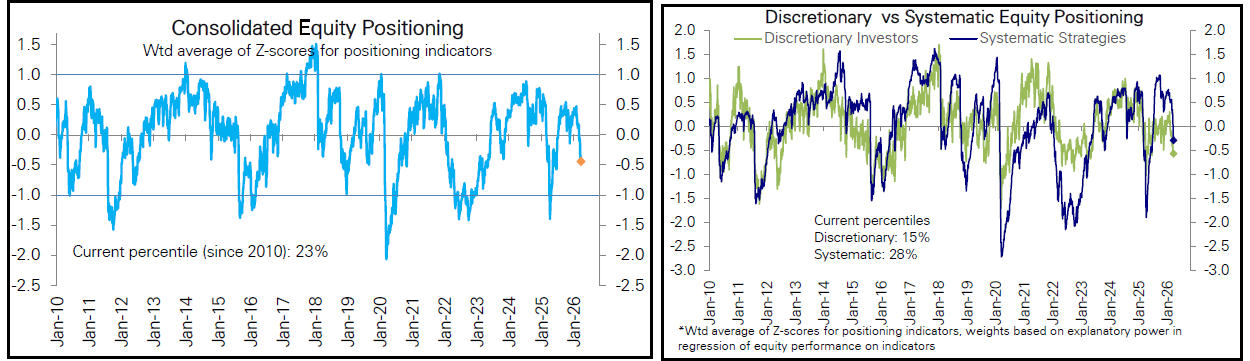 Il  positioning, come  era prevedibile,  si è  ridimensionati ulteriormente, con la misurazione aggregata che è arrivata al 23mo percentile. I gestori discrezionali  sono scesi al  15mo, mentre le  strategie quantitative sono al 28mo. C’è  ancora spazio di ribasso,  nel  caso  la tensione dovesse salire ancora,  perchè,  sul  monitor di  Deutsche Bank non abbiamo raggiunto i livelli del liberation day, o del 2022.   Però  sicuramente siamo ai minimi da 9 mesi,  e  con possibilità  di squeeze se  le  cose  girano al meglio.