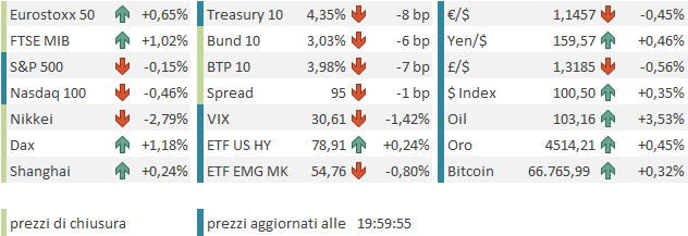 Le  piazze europee chiudono oggi con discreti progressi, eventualmente indifferenti alle headlines sulla  guerra, e gratificate dal fatto che oggi è solo  il WTI a salire,  mentre il Brent ha chiuso la  seduta stabile e il gas europeo ha perso addirittura qualcosa. Anche la correzione dei rendimenti citata sopra ha offerto presumibilmente supporto al  sentiment,  anche se ha tolto  supporto all’€. La  divisa unica cede mezza figura riportandosi sui minimi di metà  marzo. Tra le  commodities,  detto  di oil e gas, i metalli preziosi hanno perso parte della baldanza mostrata in giornata.