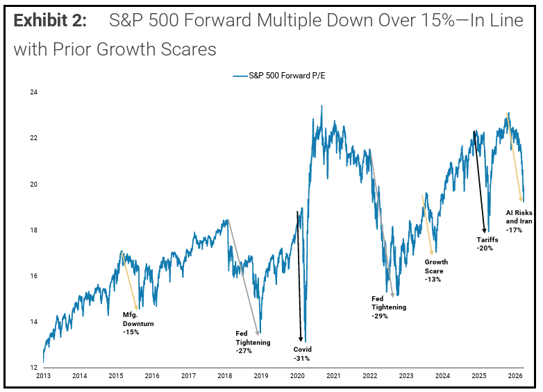La  sostanziale tenuta  delle stime  di earnings ha fatto  si che il Forward PE dell’S&P 500 sia sceso sotto 20x per la  prima volta dal quarto trimestre del 2023. Morgan Stanley ha osservato che il calo dei multipli è  paragonabile  alle recenti “growth scare” di varia natura dal  2013 ad  oggi.