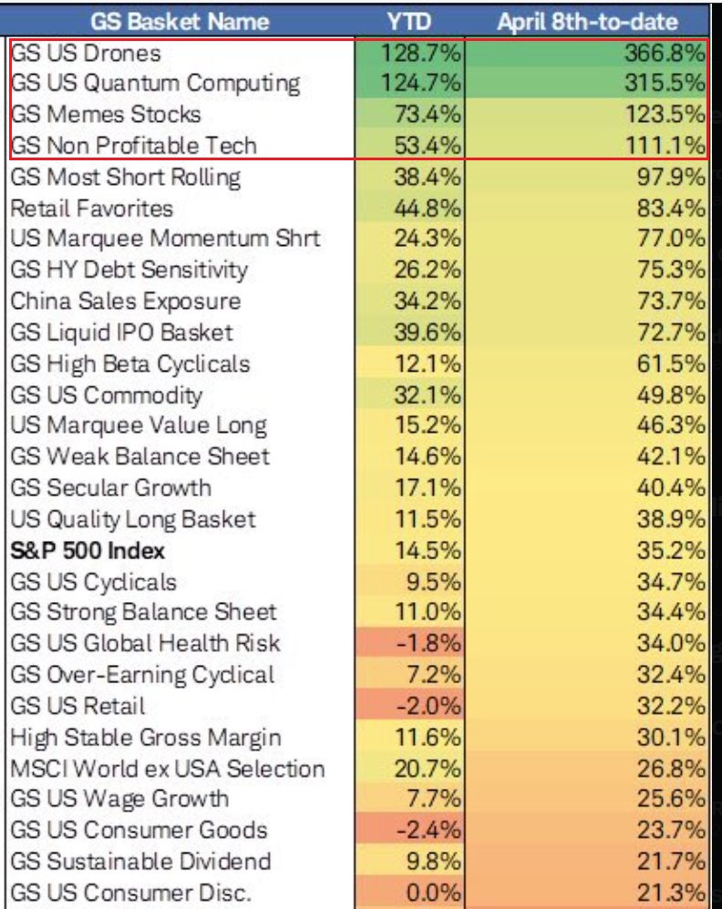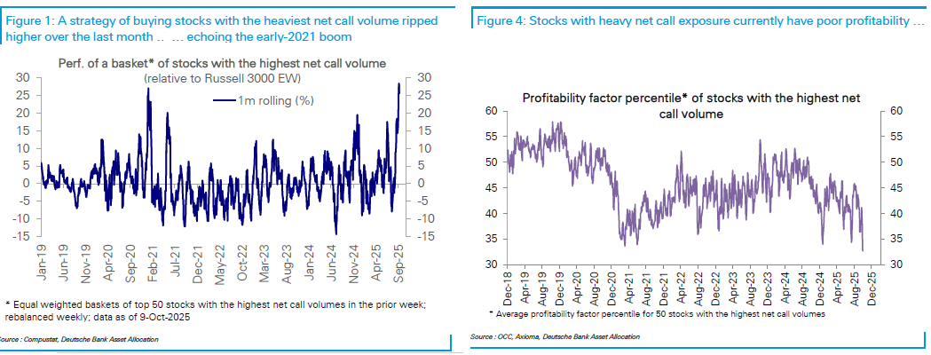 Nel suo monitor di positioning, Deutsche Bank ha notato che la performance rolling ad un mese delle azioni oggetto del maggior numero di call è stata esplosiva rispetto all’indice generale, sui livelli del 2021, e queste azioni in media hanno una profittabilità molto bassa (perche molte, come il Quant Computing, e diverse del settore Small Modular Reactors e relativo fuel) non fanno nemmeno fatturato al momento.