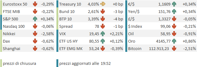 Discreto rimbalzo ieri sera a Wall Street, con l’S&P 500 in progresso dell’1.56%, il Nasdaq 100 del 2,21%, il Russell 2.000 Small Caps del 2.79% e le Magnificent 7 del 2.45%. Quindi più della metà del calo di venerdì è stato recuperato. Naturalmente, l’abbassamento dei toni di Trump e Vance nel week end verso la Cina ha avuto un grosso ruolo nel rimbalzo. Non a caso le azioni cinesi quotate a Wall Street ieri hanno fatto bene (Ali Baba +5%, Baidu’ +3%, JD.Com +4.5% etc).