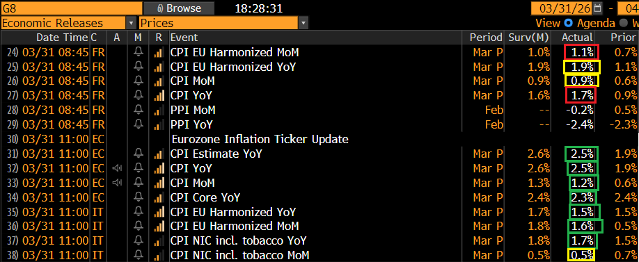 Se i numeri francesi di marzo sono usciti marginalmente sopra attese, quelli italiani sono discretamente sotto e così il CPI europeo è uscito più basso delle attese, e con la inflazione core, ancora non impattata dallo shock, in ulteriore calo. Come detto ieri, un balzo dell’1% del CPI in un mese non è certo bello, ma i mercati lo scontavano per bene.