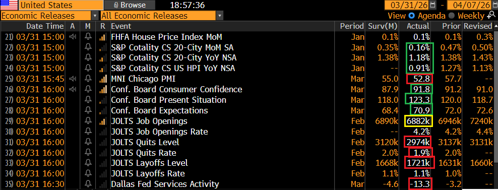 I Job Openings sono relativi a febbraio e come tali “old news”. Le offerte sono uscite in linea con le attese, ma gennaio è stato rivisto clamorosamente al rialzo, ed è tornato ben sopra i 7 milioni di offerte. Però gli altri dati sono negativi, con dimissioni volontarie in calo (meno dinamicità del mercato), licenziamenti in rialzo e assunzioni in rallentamento. In generale poco brillante, ma vedremo le revisioni, e poi vedremo lo sconquasso di marzo, se ci sarà.