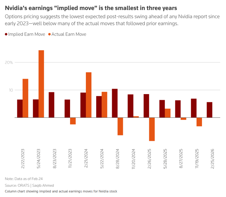 In questo contesto l’azionario europeo ha chiuso con buoni progressi, che hanno portato Stoxx 600, Eurostoxx 50, CAC 40, e Ibex ai nuovi massimi storici, e il FTSE Mib ai massimi dal novembre 2000. Direi uno sviluppo decisamente bullish per l’azionario continentale e non solo. Modesti movimenti per i rendimenti e un moderato recupero per l’€ completano il quadro. A 2 ore dalla chiusura i guadagni a Wall Street resistono in una price action tranquilla. Vediamo se Nvidia guasta la festa o la esalta. Il mercato delle opzioni prezza gli scostamenti post risultati più modesti da 3 anni a questa parte (sempre un buon 5% per lato)