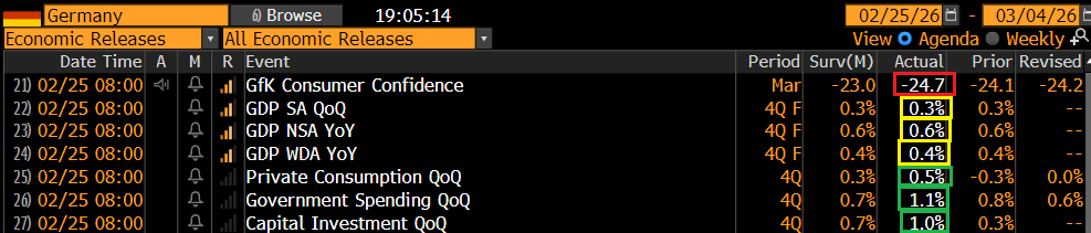Sul fronte macro, la lettura finale del GDP tedesco del quarto trimestre 2025 ha lasciato più o meno invariata la stima, ma i dettagli mostrano forza nei consumi e nella spesa pubblica, e anche negli investimenti, bilanciati da ridimensionamento nel canale estero e nelle scorte, cosa che depone bene per il trimestre in corso.