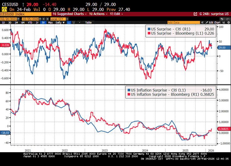 Il fatto che i principali dati macro ieri siano stati buoni (ADP settimanale e Consumer Confidence) ha presumibilmente favorito quest’effetto. In realtà in aggregato i dati macro sono supportivi da un po’, come mostra la direzione dei surprise index di Citi e di Bloomberg, ben sopra zero. E’ questa resilienza del ciclo, insieme alla bontà dell’earning season, ad aver impedito finora, a mio parere, all’S&P 500 di cedere alla pressione che viene dal tech e dai settori messi in crisi dall’AI, che sono molto “pesanti” per via delle loro dimensioni sul totale.