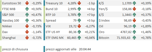 Queste improvvise aperture su quello che è sembrato essere il principale scoglio ad un cessate il fuoco effettivo, e connessa riapertura di Hormuz, hanno frenato i rialzi dell’oil (nel pomeriggio il WTI aveva superato l’8% di progresso e superato di nuovo i 100 Dollari) e mandato in positivo Wall Street. Così anche le piazze europee hanno ridotto i passivi e in alcuni casi (Milano) sono passate in positivo. Però a guadagnare oggi è stato l’energy, accompagnato a distanza dai settori difensivi ( Utilities, Health Care, Real Estate) mentre tech e ciclici hanno guidato i ribassi. Rendimenti e spreads hanno ignorato le news, continuando a rimbalzare dai livelli di ieri. Ma l’€ ha continuato a recuperare, superando il livello di 1.17 vs Dollaro, visto l’ultima volta oltre un mese fa a inizio marzo. Tra le commodity, se l’oil ha ridotto i progressi, i preziosi hanno continuato a salire.