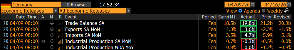 In mattinata non c’erano dati macro di particolare rilevo, a parte la bilancia commerciale di febbraio in Germania, discretamente dinamica con export e import sopra attese, e la produzione industriale tedesca per lo stesso mese, invece anemica.