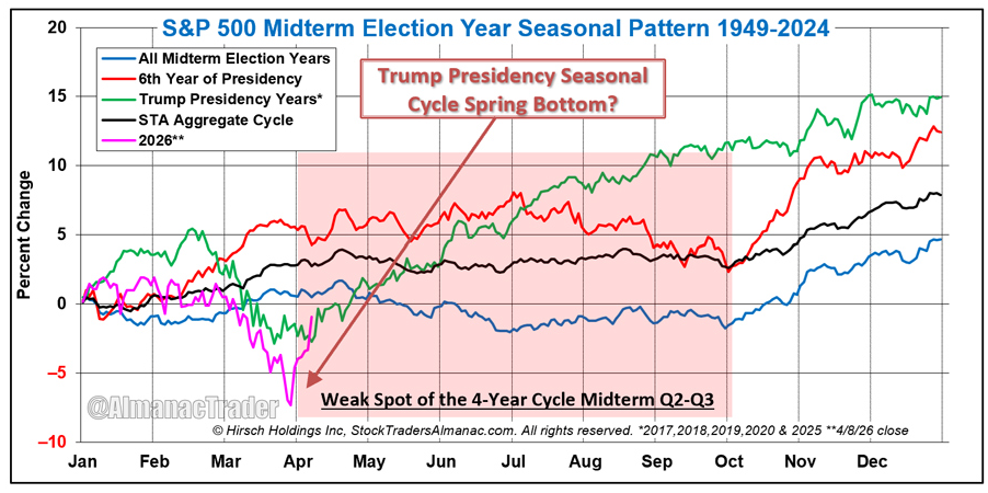 Infine, lo Stock Traders’ Almanac ha pubblicato ieri un grafico interessante, che mostra come il 2026 si stia finora comportando in linea non con la media degli anni in cui si tengono lee Midterm, ma con la media degli anni di presidenza Trump. Si forma un minimo tra marzo e aprile e poi il mercato recupera nel corso dell’anno, come l’anno scorso.