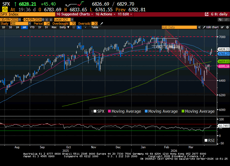 Chiusura decisamente robusta quella di Wall Street ieri sera, con l’S&P 500 in progresso di un 2.51%, e il Nasdaq 100 in guadagno del 2.9%. Molto bene anche il Russell 2.000 a +2.97% e le Magnificent 7 con un +2.6%. Il Philadelphia semiconductors è salito addirittura del 6.34%. Personalmente stento a crederlo, ma l’S&P 500 è tornato a meno di un 3% dai massimi storici segnati in chiusura il 27 gennaio. Il 30 marzo aveva chiuso giù del 9%. Un recupero decisamente rapido. Molto meno impressionante, per usare un eufemismo, l’effetto sui bonds: il rendimento del treasury 10 anni e quello del 2 anni sono rimasti invariati alla fine.