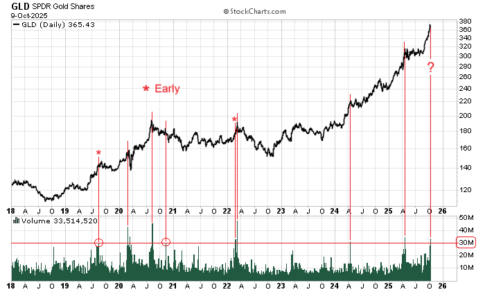 Una price action interessante di ieri è quella dell’oro, che ieri ha aperto forte, sulla scorta del superamento di quota 4.000, ha fatto nuovi massimi e poi ha ritracciato chiudendo sotto 4.000, con forti volumi. Nel grafico sotto, che riporta la price action dell’ETF GLD, per rappresentare anche i volumi, si nota che questo tipo di configurazione, ovvero una candela di inversione (qui è un engulfing pattern) dopo un violento rialzo, con volumi elevati, ha rappresentato spesso un top di breve.