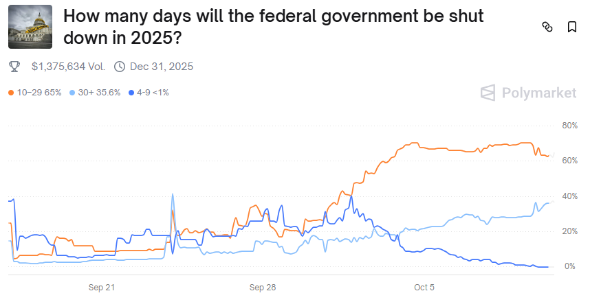 Tornando alle questioni più immediate,  riguardo lo shutdown, giunto al decimo giorno, non sembrano esserci novità di rilievo nel muro contro muro tra Repubblicani e Democratici. Polymarket ormai da una probabilità del 35% che lo shutdown duri più di 30 giorni.