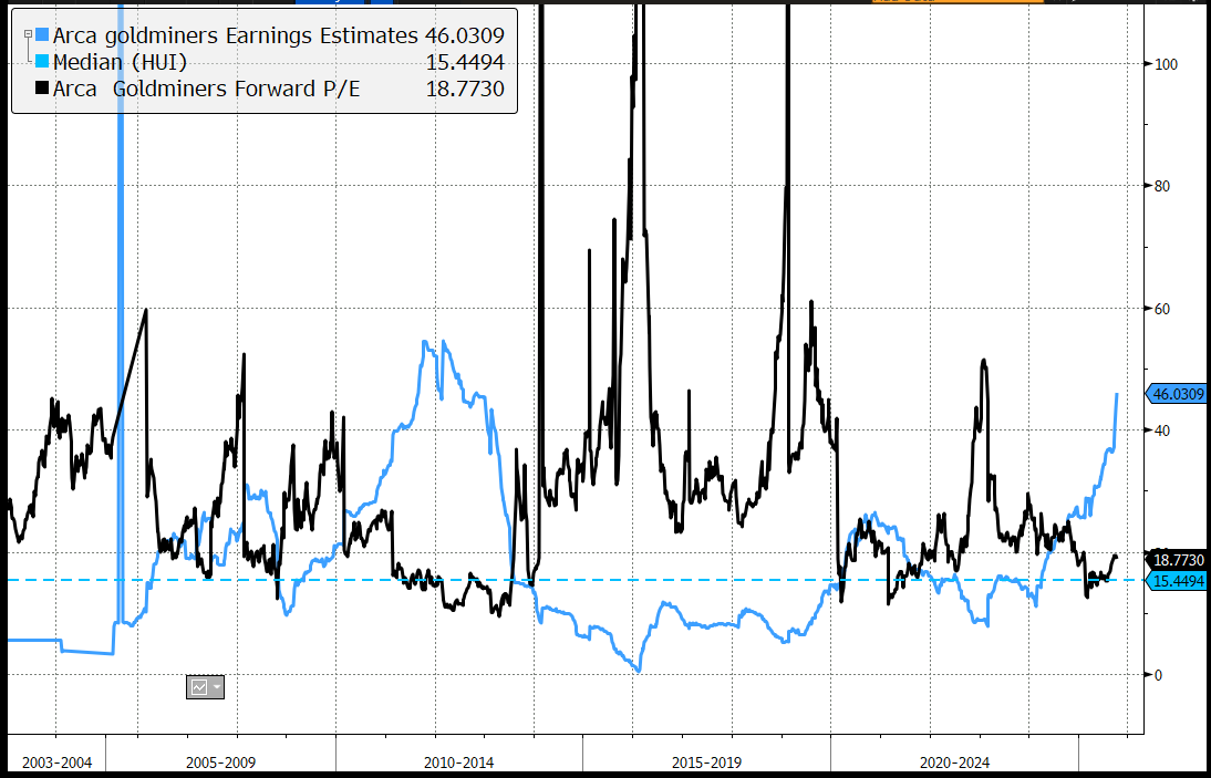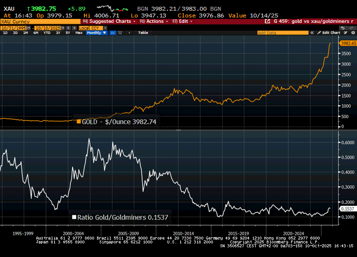 Detto questo, e ribadito che un consolidamento dell’oro può causarne uno anche più forte sui Goldminers, ritengo che, se l’oro non ritraccerà parecchio del rally degli ultimi 2 anni, tornando sotto 3.000 per intenderci, ai livelli attuali nei goldminers c’è ancora valore, nonostante la corsa. In effetti, il ratio tra goldminers e oro resta piuttosto basso, a indicare che la rivalutazione del comparto è ancora modesta a fronte di quella del metallo (e mettiamoci pure il record dell’argento).