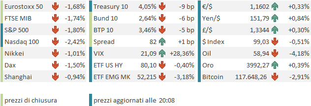 Le borse europee non potevano non reagire a queste sollecitazioni. Qualunque turbativa del global trade e del ciclo globale non può lasciarle indifferenti. Gli indici continentali hanno chiuso mostrando perdite rilevanti, e una distribuzione settoriale analoga a quella USA, con i difensivi ad outperformare e tech e ciclici penalizzati. I rendimenti hanno reagito di conseguenza, mostrando robusti cali.