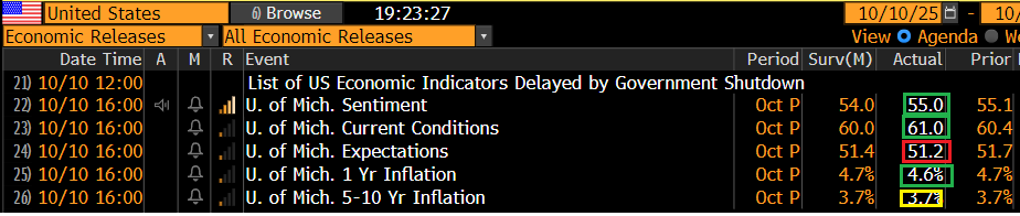 Nel pomeriggio, grazie al fatto che l’università del Michigan è privata, abbiamo avuto un report, ovvero la confidence dei consumatori preliminare di ottobre. Se si pensava che lo shutdown avrebbe pesato sul morale degli americani, per il momento questa piccola survey non lo registra.
