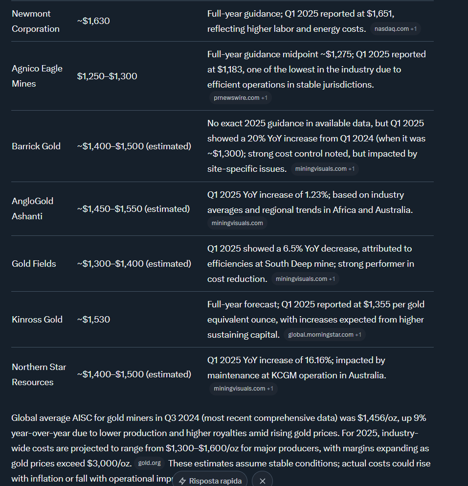 Come mai gli utili sono stati così lenti a salire, visto che l’oro ha fatto + 13% nel 2023 a 2062$, +27% nel 2024 a 2624$, e nel 2025 sale del 50%  a 4.000$?