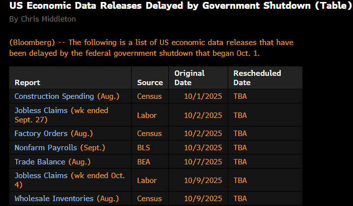 Nel pomeriggio non erano previsti dati in US, causa Shutdown. In luogo del consueto monitor, Bloomberg pubblica un recap dei principali dati la cui pubblicazione è stata rinviata. Un elenco che rischia di allungarsi parecchio, anche perchè le rilevazioni delle varie survey sono ovviamente bloccate, e anche dopo lo sblocco ci vorrà tempo per recuperare.