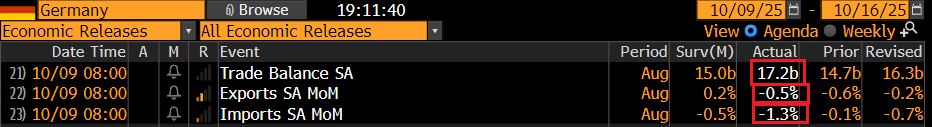 L’unico dato in pubblicazione oggi in Europa era il trade balance tedesco di agosto, deludente, come molti dati di quel mese, specialmente dal punto di vista import, che è la voce che ha gonfiato di più il surplus.