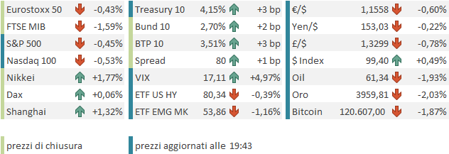 Le piazze europee hanno in parte accusato le vendite in USA, e chiudono con passivi moderati, con il Dax che riesce a mantenere la parità, e Milano invece che sottoperforma abbondantemente, zavorrata dalla reazione di Ferrari all’abbassamento della guidance a 5 anni e dalla debolezza delle banche. Se i rendimenti mantengono la tendenza a rimbalzare dopo la robusta discesa di ieri, l’€ cala ulteriormente, rompendo quota 1.16 vs Dollaro e marcando i minimi da inizio agosto. Pesanti le commodities, penalizzate dal calo dell’oil, e dell’oro, mentre i metalli industriali vanno in controtendenza.