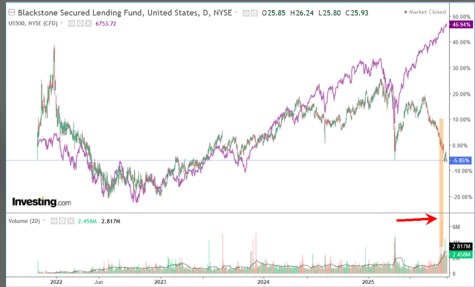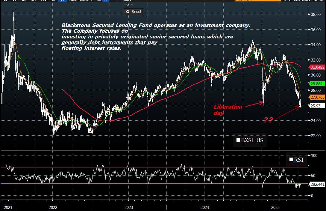Peraltro, ieri mi è cascato l’occhio su un Fondo che investe in Senior Secured Loans in America. La performance è decisamente deludente nell’ultimo periodo. Stamattina mi son preso del tempo per guardare un po’ il comparto di questi veicoli, e per quanto tra un fondo e l’altro ci possa essere anche una discreta differenza di performance, gli movimenti sono assolutamente correlati tra di loro, a indicare quello che è un preciso andamento del mercato di riferimento, ovvero quello dei prestiti bancari garantiti da beni dell’azienda debitrice. Qui sotto ho riportato il grafico di uno dei principali veicoli, che mostra il crash del liberation day, perfettamente spiegabile con l’angoscia per il ciclo USA scoppiata quando furono comunicate da Trump le elevatissime aliquote dei dazi reciproci.
