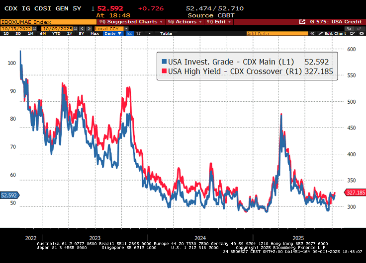 E lo stesso si può dire per il credito quotato, ovvero i corporate bonds, che hanno mostrato di recente un allargamento marginale, in particolare se paragonato a quello occorso in occasione del Liberation day (nel grafico sotto i credit default swap index US, investment grade e High Yield)