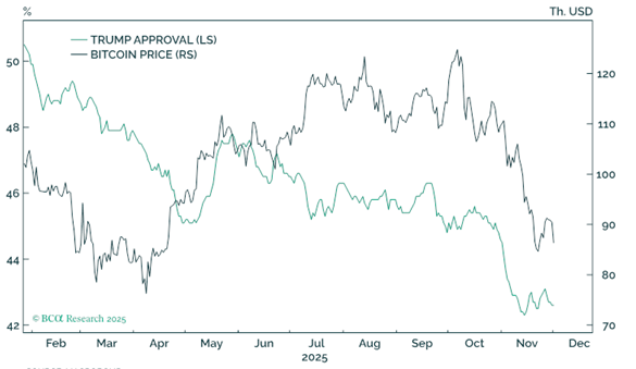 nel frattempo, qualcuno (BCA)ha messo in relazione il cattivo momento delle cripto con il deterioramento della popolarità di Trump, che tanto si sta spendendo per il settore. Non è chiarissimo però chi stia guidando chi.
