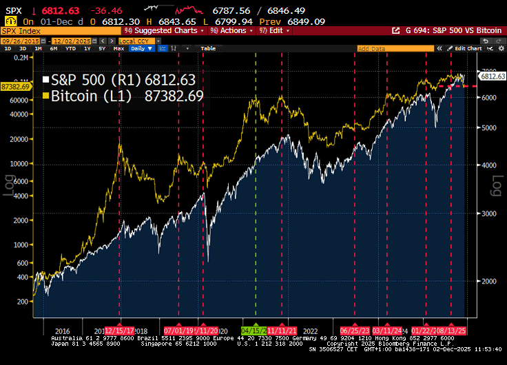 Gli investitori continuano a guardare parecchio ai movimenti delle cripto per via dell’indiscussa correlazione, ma è anche vero che Bitcoin è in calo del 30% rispetto ai massimi di inizio ottobre, mentre l’S&P 500 al momento perde appena l’1.5% dai massimi del 29 ottobre. Anche se il 20 novembre era arrivato a perdere oltre il 5%. Quindi, a meno che Wall Street non riprenda a scendere bruscamente, in questo caso per il momento il segnale è stato valido, ma di scarsa qualità.