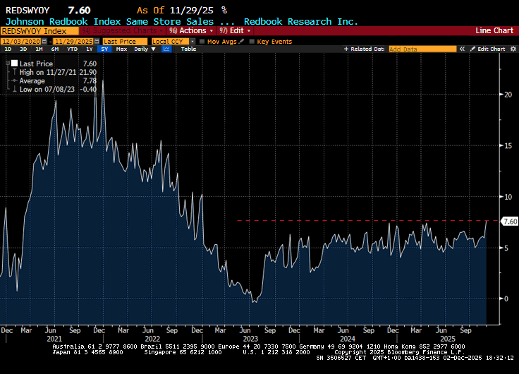 Il redbook (same store sales settimanali anno su anno) della settimana del Ringraziamento mostra peraltro un robusto aumento, ai massimi, pur di poco, degli ultimi 3 anni.