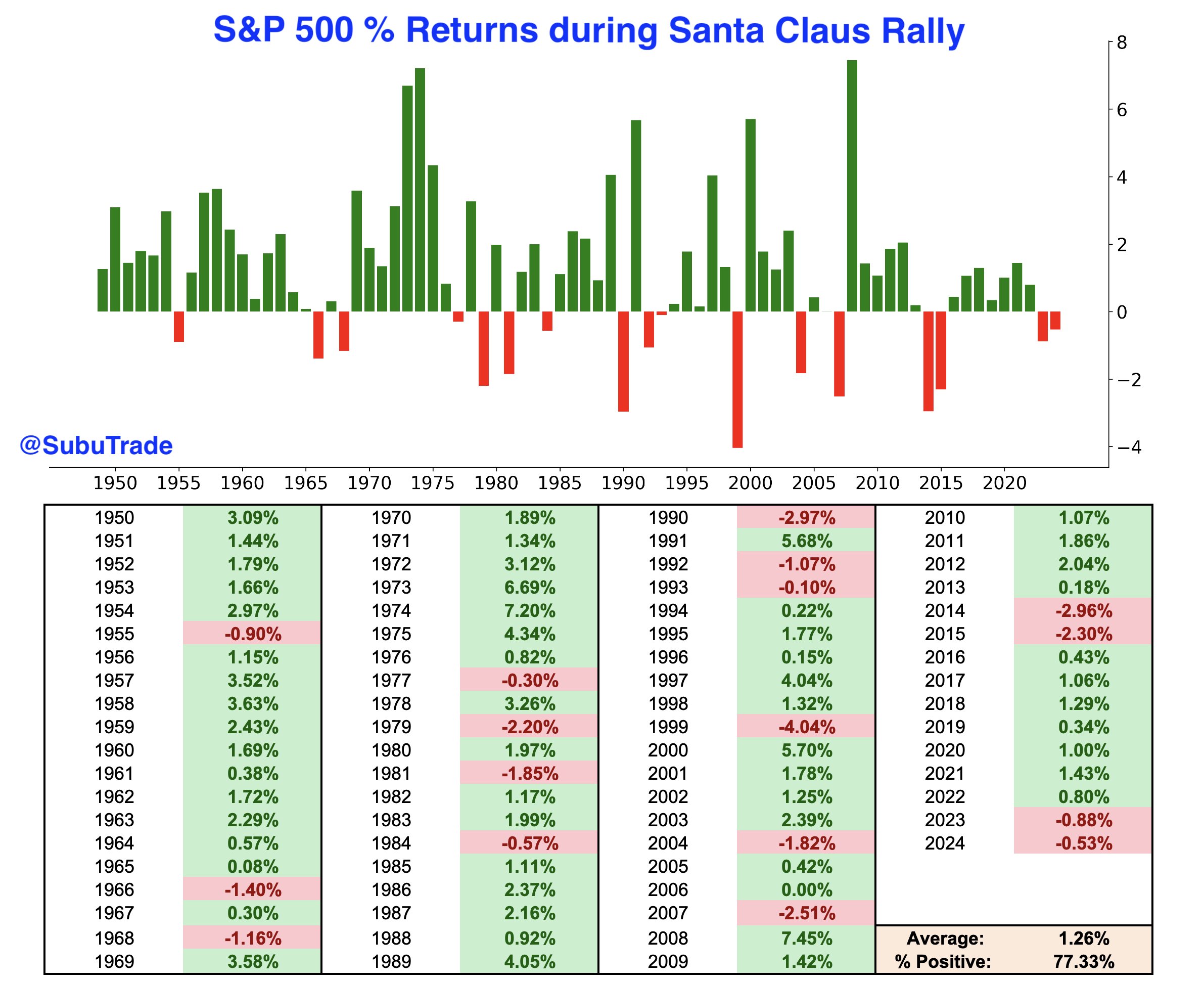 Il cosiddetto “Santa Rally”, ovvero il rally di natale, gode di una serie di interpretazioni diverse. Ma la più accreditata è che riguarda le ultime 5 sedute dell’anno dal 24 in poi (sia il 24 che il 26 sono di borsa aperta a Wall Street) più le prime 2 dell’anno successivo. Subutrade ha aggiornato la statistica e osservato che il periodo in questione ha un win ratio del 77%. Gli ultimi 2 anni però è andata male. Detto questo, non è mai successo di avere 3 anni consecutivi senza il Santa Rally.