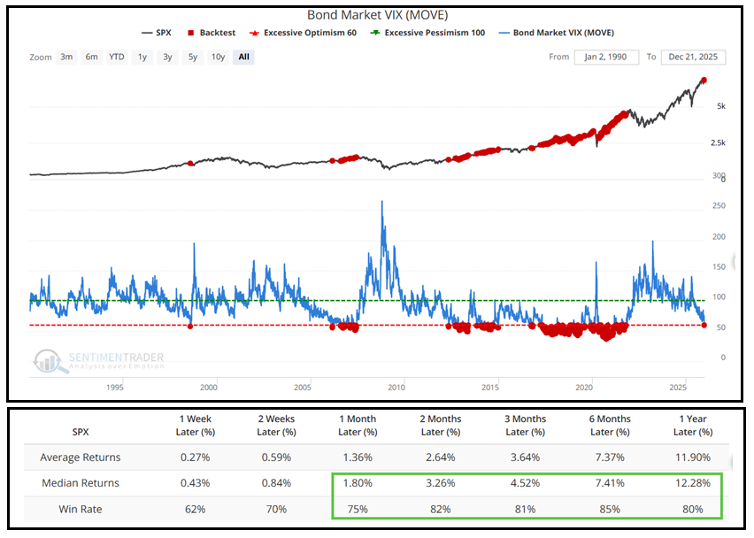 Sentimentrader ha poi osservato che la volatilità implicita sui bonds è recentemente crollata (l’indice usato il MOVE di Bank of America, che prende i dati dalle opzioni OTC su gli Swap USA). Si tratta un po’ di un mistero per me visto che sui tassi USA e globali ci sono mille variabili in movimento. Ma tant’è, effettivamente la volatilità implicita è calata, forse perchè è vero che negli ultimi trimestri molti rendimenti sono stati in range. Ebbene il backtest dice chee questo è un outcome positivo per l’azionario